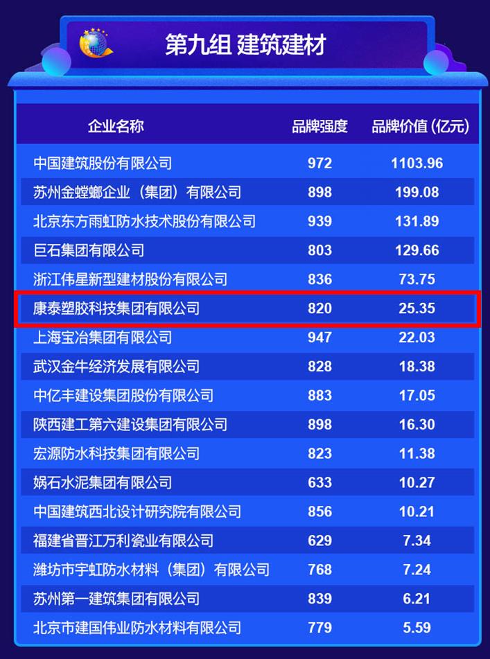 值此第四個(gè)“中國品牌日”之際,中國品牌建設促進(jìn)會(huì )貫徹習近平主席提出的“推動(dòng)中國制造向中國創(chuàng )造轉變、中國速度向中國質(zhì)量轉變、中國產(chǎn)品向中國品牌轉變”重要指示精神,在5月10日發(fā)布了“2020年中國品牌價(jià)值榜單”。榜單從企業(yè)品牌、產(chǎn)品品牌、區域品牌和自主創(chuàng )新品牌四大方面發(fā)布了多行業(yè)、多領(lǐng)域的前50排行榜。在“2020年中國品牌價(jià)值榜單”中,康泰塑膠科技集團品牌價(jià)值為25.35億元,比2016年的13.51億元增加了11.84億元,升幅88%,再創(chuàng )新高,彰顯了“康泰”品牌的強度、知名度、美譽(yù)度。