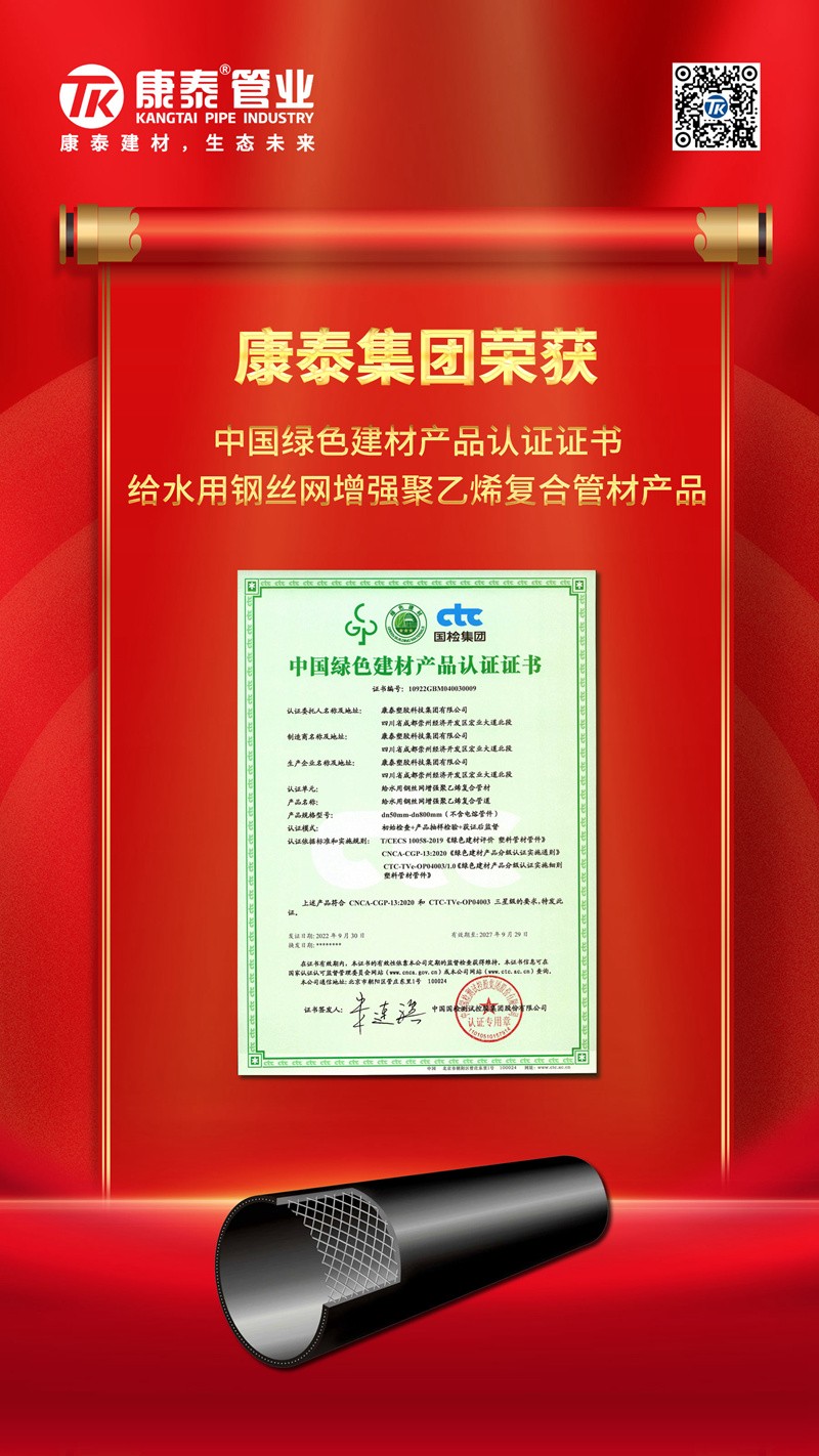近日,康泰塑膠的給水用聚乙烯(PE)管材、管件產(chǎn)品,燃氣用埋地聚乙烯(PE)管材、管件產(chǎn)品,冷熱水用聚丙烯(PPR)管材、管件產(chǎn)品,埋地用聚乙烯(PE)雙壁波紋管材產(chǎn)品,冷熱水用耐熱聚乙烯(PE-RT)管材產(chǎn)品,給水用鋼絲網(wǎng)增強聚乙烯復合管材產(chǎn)品順利中國國檢測試控股集團股份有限公司認證審核,獲得中國綠色產(chǎn)品認證證書(shū)。充分展現了康泰塑膠獲證產(chǎn)品在多種綠色屬性和考核指標的硬核實(shí)力。