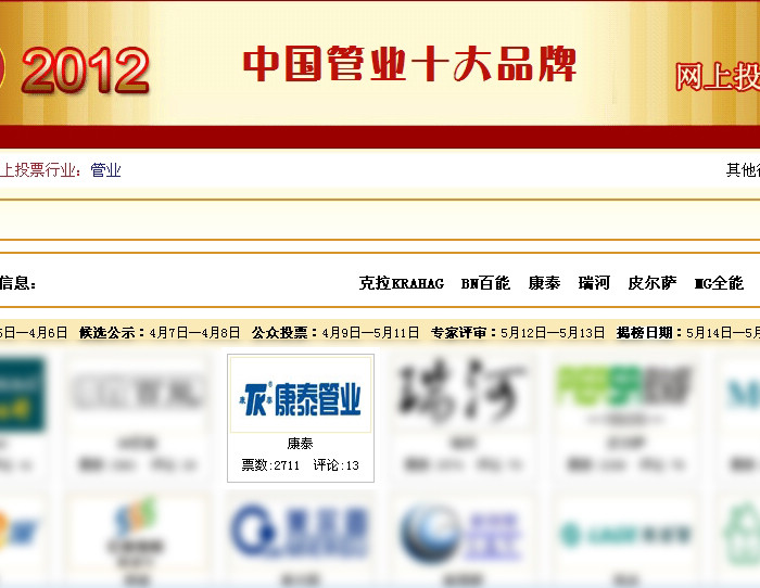 圖為康泰塑膠科技集團獲2012年中國管業(yè)十大品牌評選網(wǎng)頁(yè)